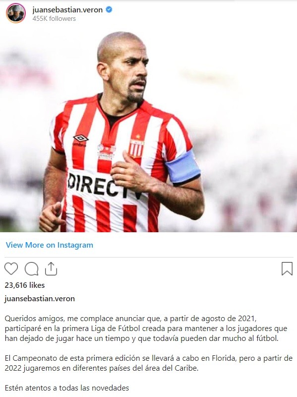 Según publicó en su cuenta de Instagram, Verón será parte de una liga de ex futbolistas que se desarrollará en Florida, Estados Unidos, a partir de agosto.