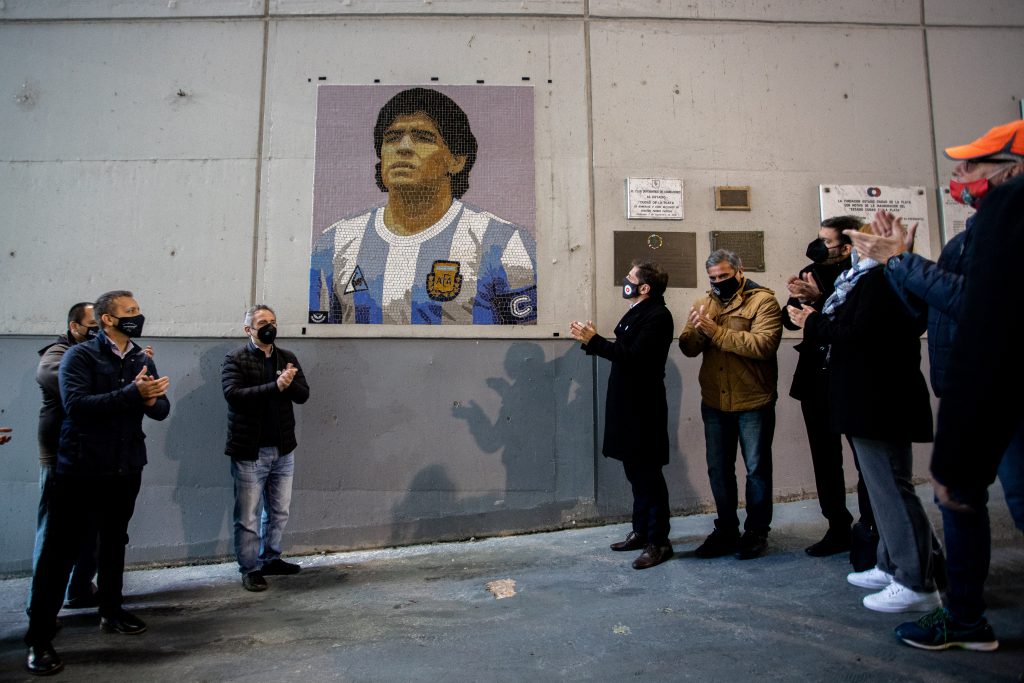 Unos minutos antes, el gobernador Axel Kicillof junto al Ministro Andrés Larroque inauguraban una escultura del artista Alejandro Marmo en homenaje a Diego y en uno de los ingresos al campo de fuero, y descubrían una mural en mosaico realizado por el grupo Comando Maradona.
