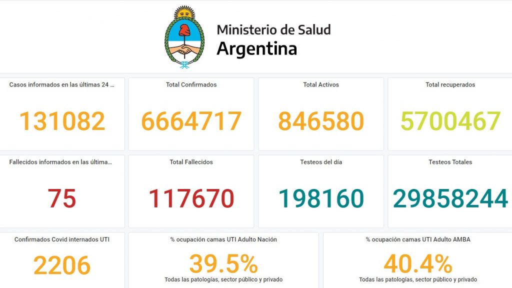 Este miércoles 12 de enero, el Ministerio de Salud informó que en las últimas 24 horas se registraron 131.082 nuevos contagios y 75 muertes por coronavirus en la Argentina. De esta manera, el tota de infectados desde que comenzó la pandemia ascendió a 6.664.717, mientras que la cantidad de fallecidos trepó a 117.670.