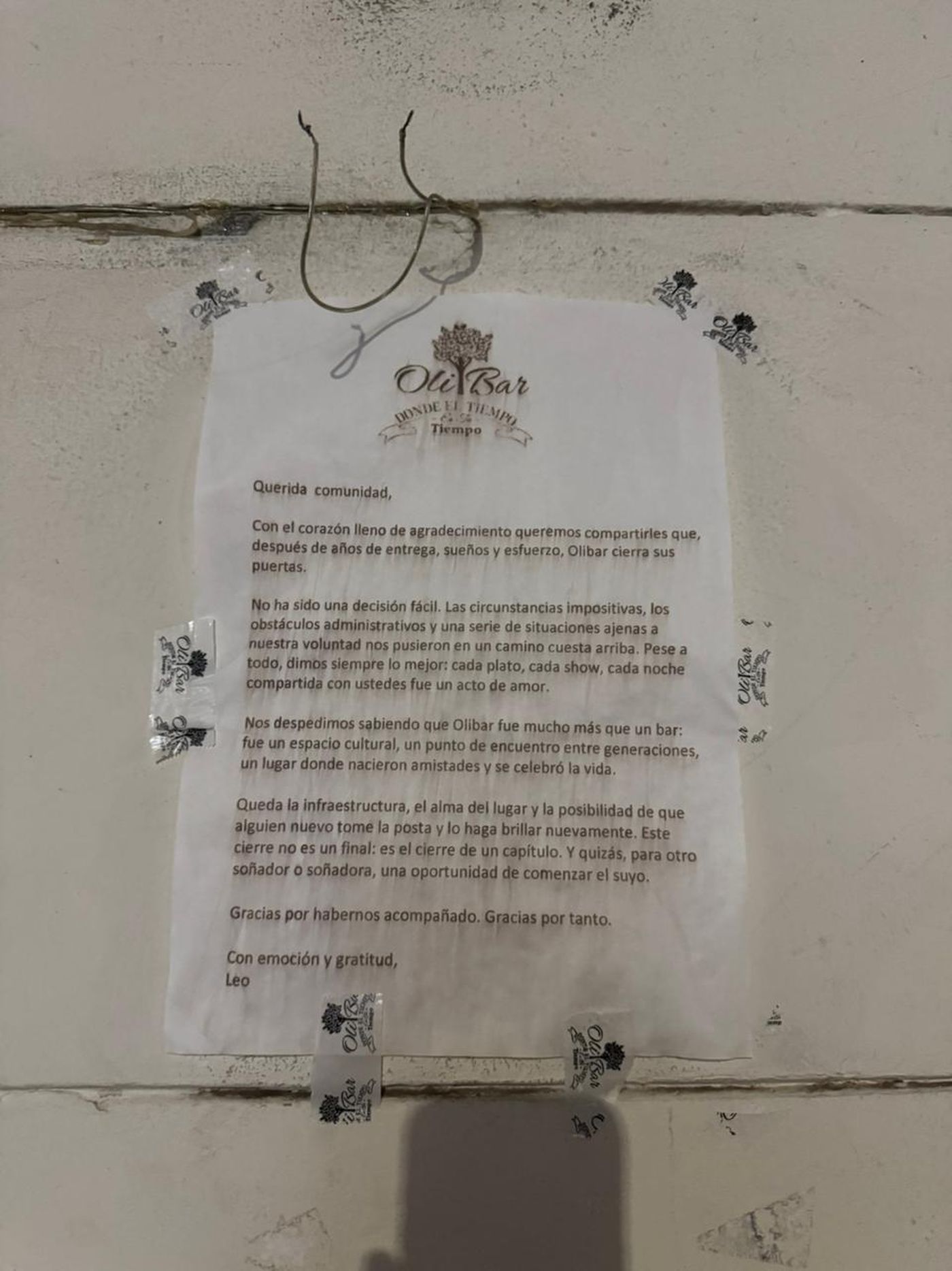 “Con el corazón lleno de agradecimiento queremos compartirles que, después de años de entrega, sueños y esfuerzo, Olibar cierra sus puertas”, comienza el escrito firmado por Leo, quien encabezaba el proyecto. En la carta, se hace referencia a las dificultades impositivas y administrativas que terminaron por hacer inviable la continuidad del emprendimiento.