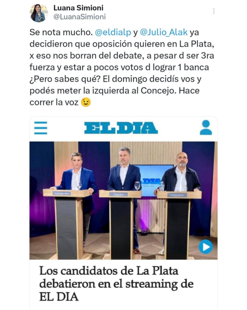 La candidata a concejal por el Frente de Izquierda Unidad (FIT-U), Luana Simioni, manifestó su repudio en redes sociales luego de que su espacio no fuera convocado al debate de candidatos a concejales de La Plata, organizado por el Diario El Día.