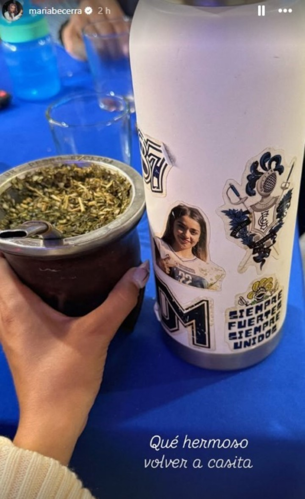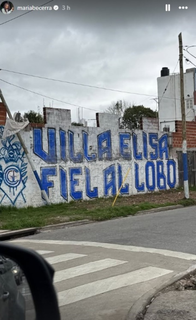 Publicó dos stories. Una de una pintada: “Villa Elisa, fiel al Lobo”. Otra con un mate y un termo con stickers de su imagen con la camiseta 22 del Tripero, un escudo y la leyenda: “Siempre fuertes, siempre unidos”.