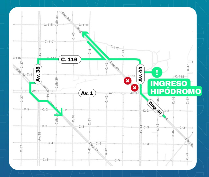 “S recomienda a los conductores que circulen por diagonal 80 hacia 120 tomar la avenida 44 (frente a la entrada del Hipódromo) y, luego, la calle 116″, aconsejaron desde la Municipalidad, y agregaron: “Quienes necesiten ingresar al centro pueden hacerlo por diagonal 74 y por avenida 32, mientras que aquellos que lleguen hasta la zona de la obra por diagonal 80 con destino al centro tienen la posibilidad de desviar por 116 hacia avenida 38”.