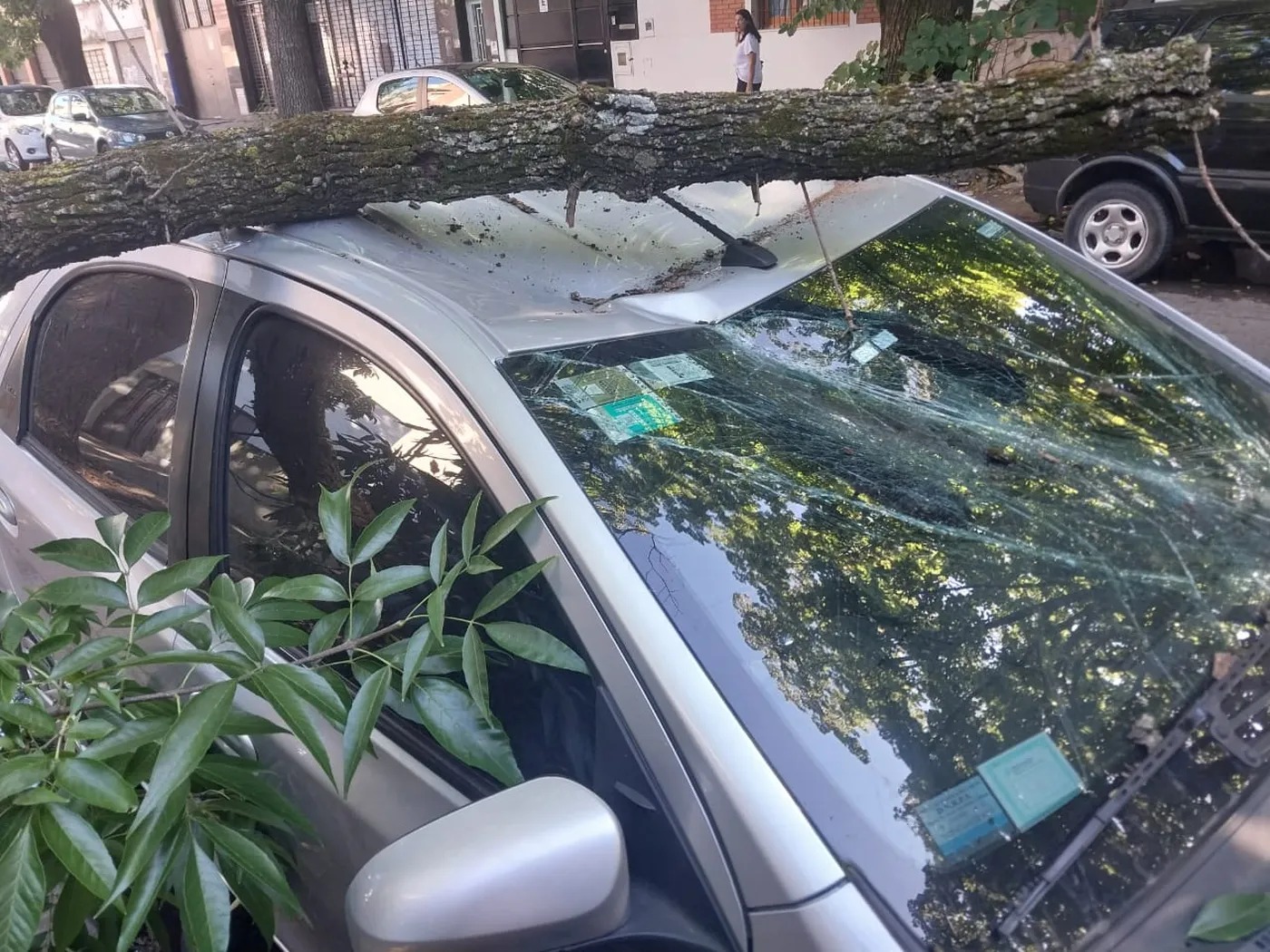 La rama principal se desprendió desde lo alto y quedó atravesada sobre uno de los vehículos, mientras otro auto resultó afectado en la parte trasera. Las hojas y fragmentos de madera quedaron esparcidos sobre la vereda y la calle.